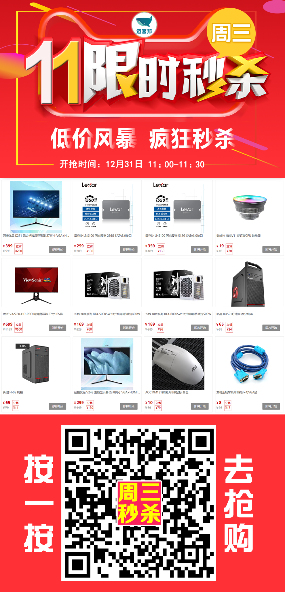 11点秒杀 | 27寸显示器,秒399元!